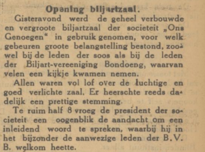 Laporan pembukaan resmi ruang biliar Ons Genoegen pada 3 Juni 1920. Sumber: De Preanger-bode, 4 Juni 1920.