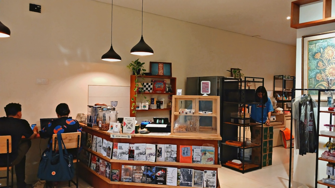 Kedai dan beberapa koleksi buku di Perpustakaan Bunga di Tembok. (Foto: Astrie Amanda).