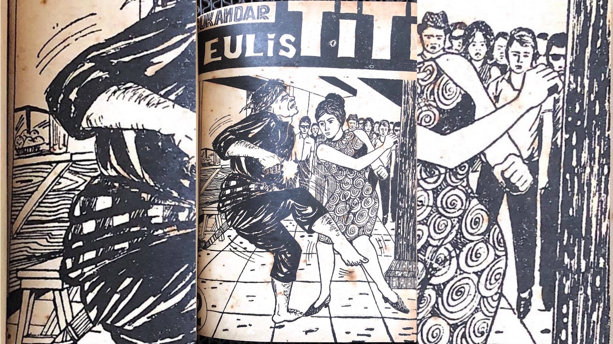 Untung ada Perpustakaan Ajip Rosidi. Di situlah, selagi sepi di akhir Mei, saya membaca Eulis Titi karya S. Sukandar (Tjaringin, Bandung, 1968). Roman berukuran A6 ini terdiri atas 12 jilid, dengan masing-masing jilid setipis 52 halaman. Satu jilid bisa dibagi ke dalam 4 bagian cerita — kiranya seraya mengantisipasi kemungkinan dijadikan serial “dongéng radio”. Total jenderal, serial ini mencakup 36 bagian. Gambar jilid dan ilustrasinya — yang disebut “hiasan gambar”— adalah karya Taufiq R.