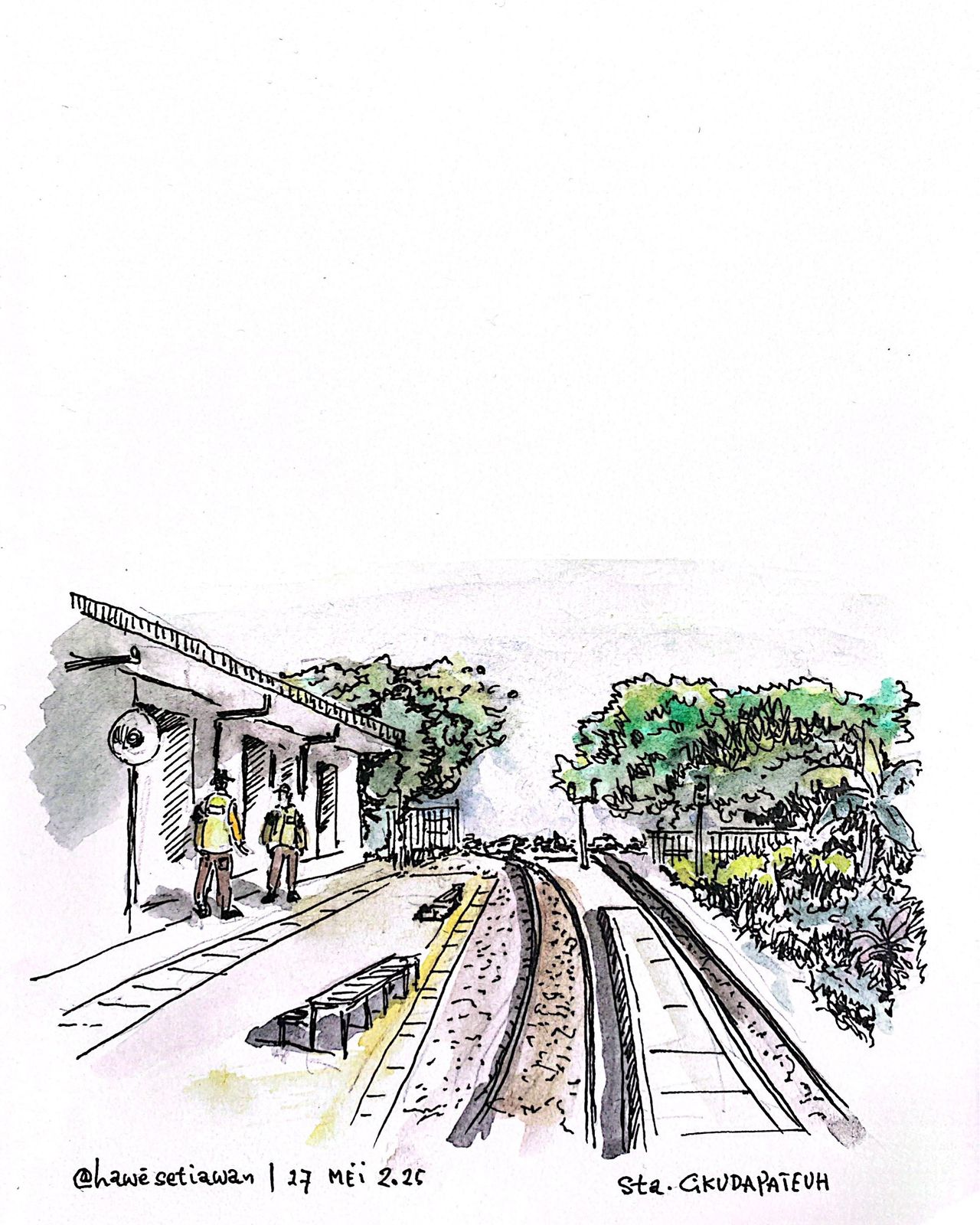 Waktu kereta tiba di stasiun Cicalengka, sketsa saya sudah rampung, bahkan sudah saya unggah ke akun medsos, itung-itung menyimpan ingatan. Sayang, di situ kali ini tidak ada waktu buat menggambar. Kami segera beranjak dengan menyewa angkot ke tujuan utama: Babakan Peuteuy, sekitar setengah jam dari stasiun, mendaki di jalur Kareumbi. Di situ, di sebuah rumah di dalam kebun, kami menginap semalam sambil mengadakan pelatihan jurnalistik buat teman-teman yang berminat menulis dalam situs jala Hanya Wacana.