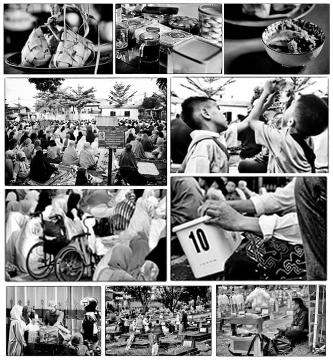Jika Ismail Marzuki mengabadikan momen Lebaran ke dalam lagu, maka saya mencoba mengabadikan momen lebaran ke dalam sebuah foto. Foto di atas menggambarkan beberapa aktivitas seperti salat Idulfitri di lapangan, kue-kue yang memenuhi meja, ketupat dan opor ayam, serta orang-orang yang sedang berziarah ke makam keluarganya.