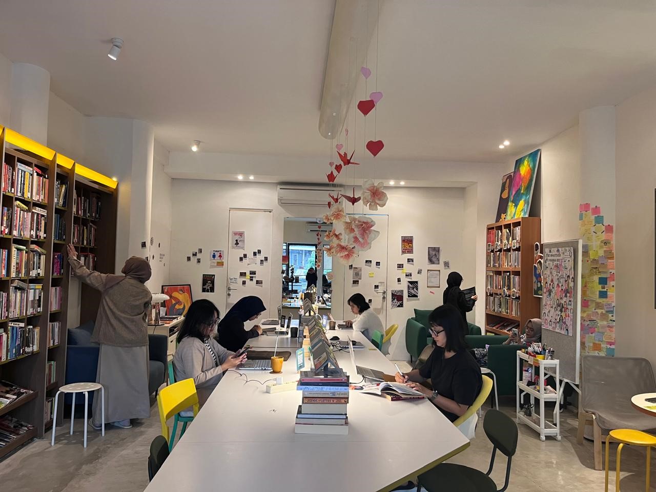 Selain itu, fasilitas yang ditawarkan pun cukup lengkap. Ada akses Wi-Fi, rak-rak buku dari berbagai genre yang bisa dibaca bebas, free flow tea, art supply bagi mereka yang ingin menuangkan kreativitas, serta loker untuk menyimpan barang agar lebih aman dan nyaman. Selama Ramadan, tempat ini juga menyediakan takjil gratis berupa sepotong bolu dan kurma. Jadi jangan khawatir untuk memilih ngabuburit di sini.