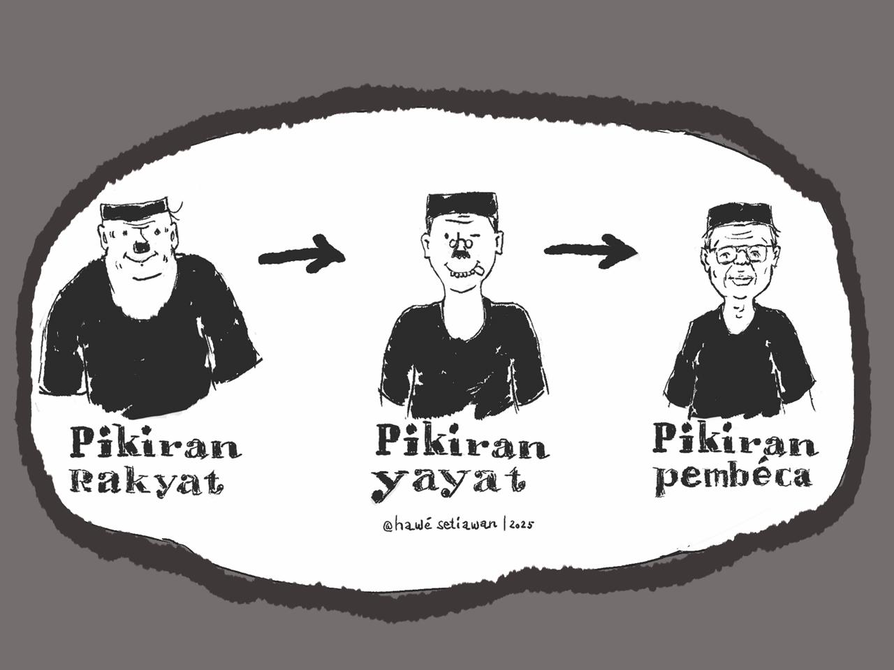 Apakah keberadaan “media warisan” (legacy media) seperti Pikiran Rakyat dapat dianggap syarat tersendiri bagi keberadaan humor seperti yang diolah Mang Yayat? Taruh kata — tapi moga-moga tidak sih — kelangsungan hidup surat kabar Pikiran Rakyat sampai tamat. Konsekuensinya bagi Mikiran Yayat pasti akan seperti hilangnya cermin bagi orang yang suka berkaca. Setidaknya, kejenakaan semboyan “dari Yayat, oleh Yayat, untuk Yayat” juga kejenakaan jargon “beritanya dapat dicangcaya” akan berkurang jika orang tidak ingat lagi akan semboyan “dari rakyat, oleh rakyat, untuk rakyat” serta jargon “beritanya dapat dipercaya”.